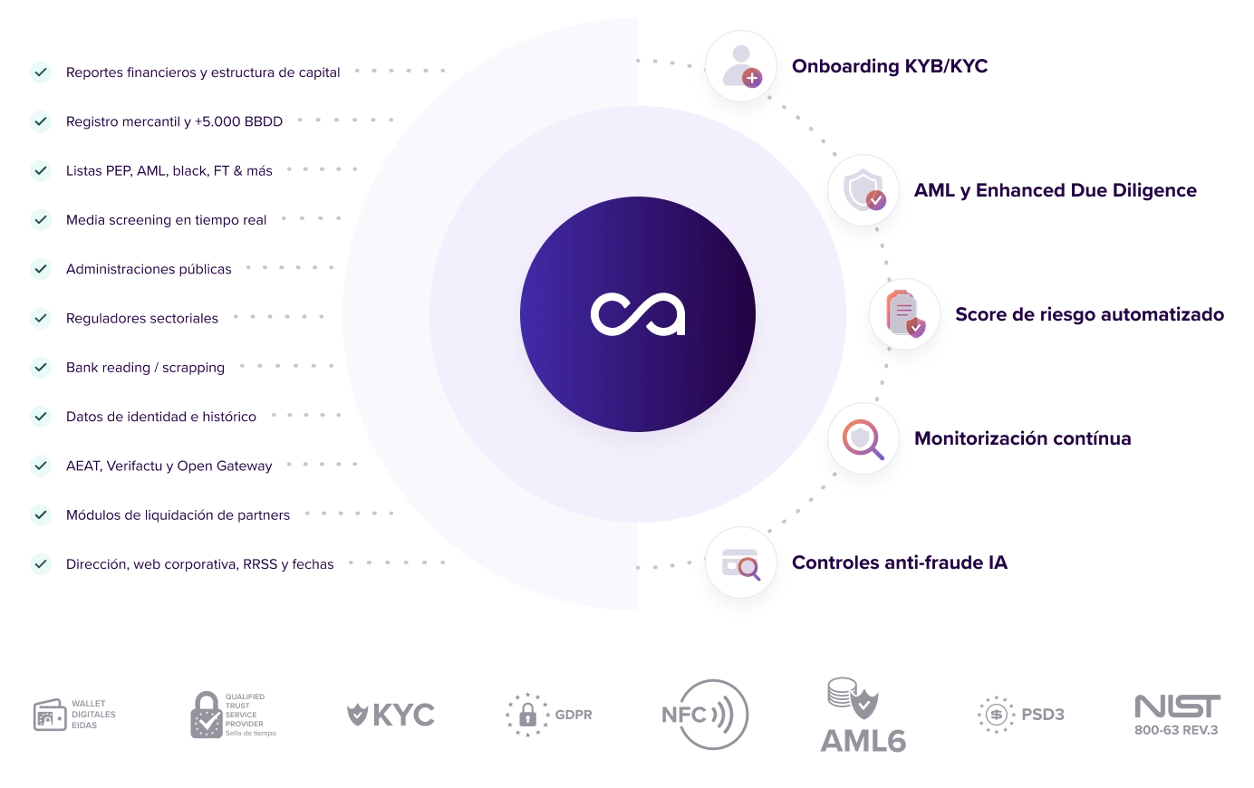 Obtén un risk score instantáneo y valida de forma automática. Cumple con las normas más exigentes y trata información y datos de forma ágil y desatendida.