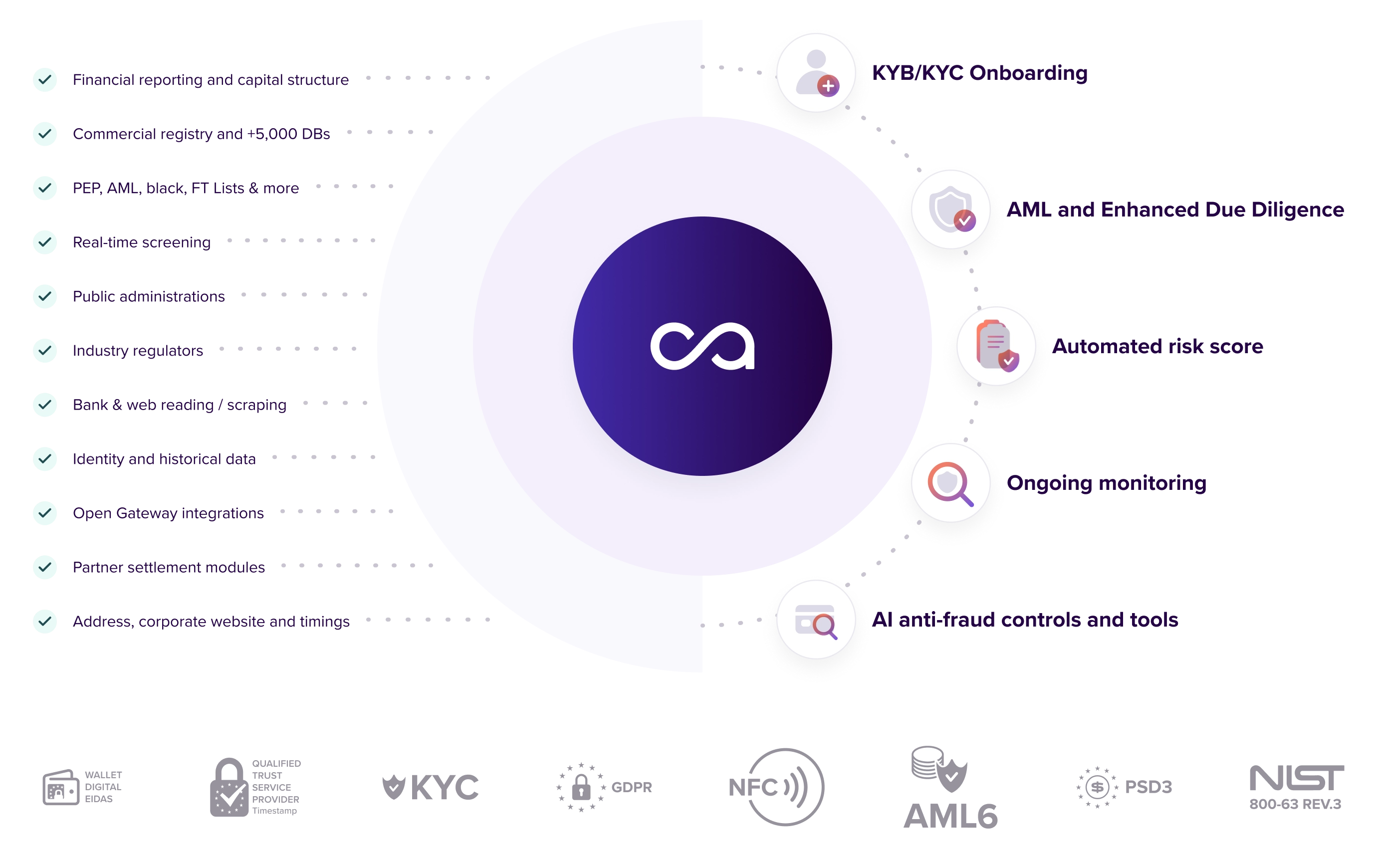 Full flow orchestration. Alerts and monitoring, back-office compliance, KYC ongoing monitoring, KYT or customization of rules to create intelligent flows. Extract audit documents, electronic signatures, check information, scores and check lists or send e-notices.