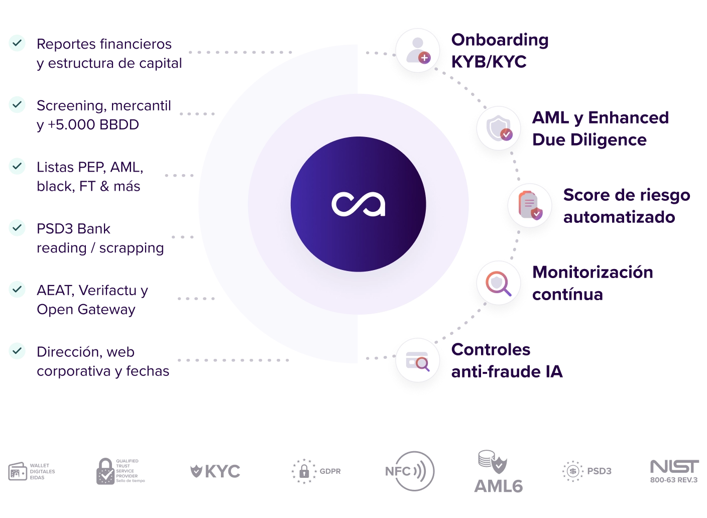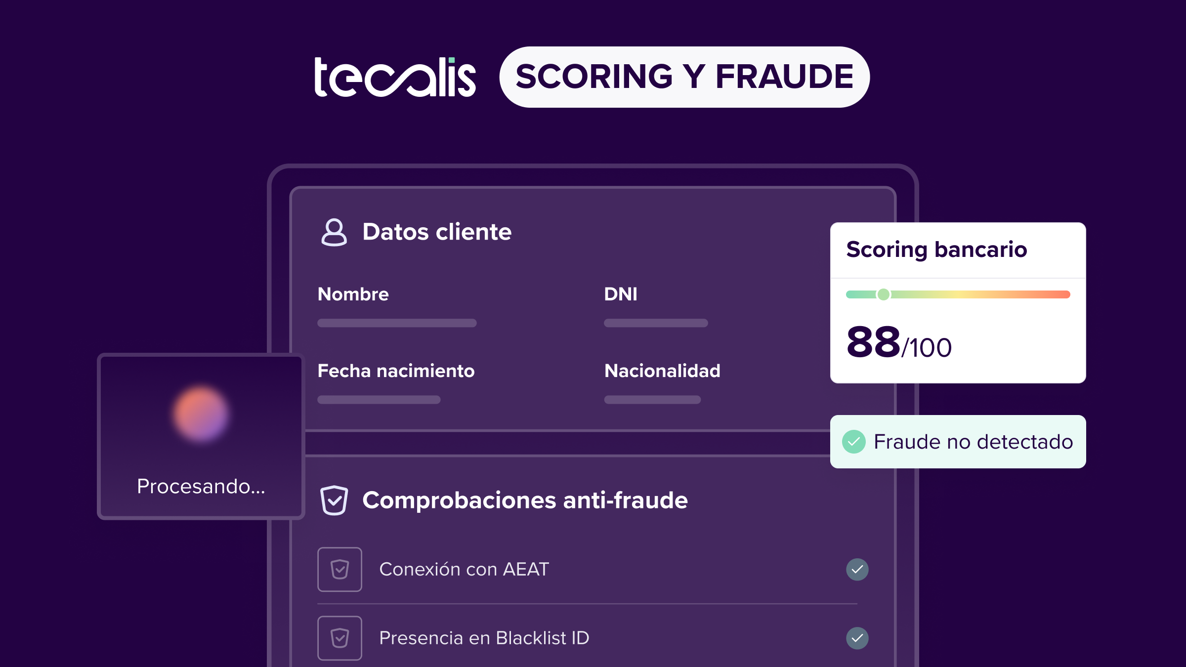 Obtén un risk score instantáneo y valida de forma automática. Cumple con las normas más exigentes y trata información y datos de forma ágil y desatendida.