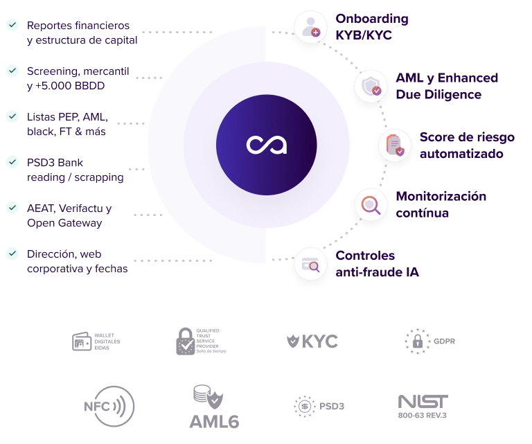 Integrado en el onboarding o solicitado posteriormente. Habilita contrataciones y altas al instante, activación de pólizas o permite pagos cumpliendo con la normativa de cada región.